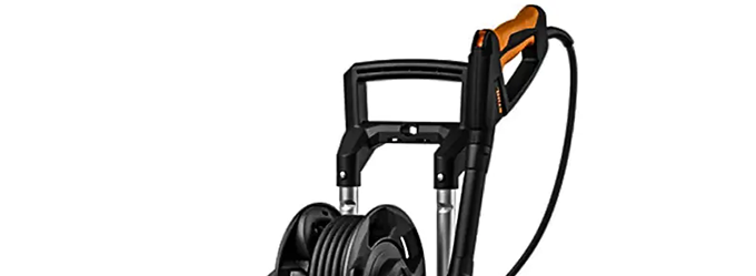 Большие колеса и выдвижная ручка позволяют легко перемещать мойку по участку, даже когда шланг полностью размотан.
